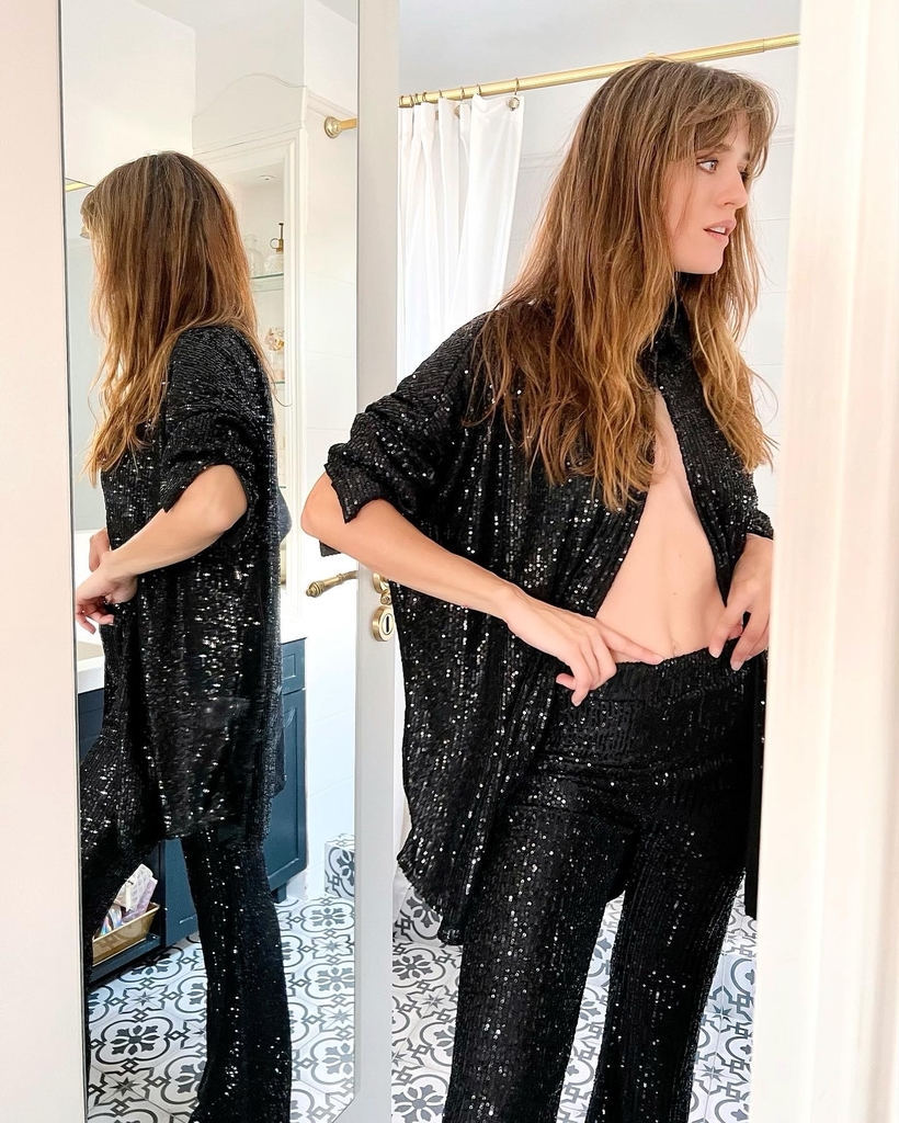 Camisa estilo boyfriend y pantalón en paillette. Pantalón semi oxford con elástico en la cintura.