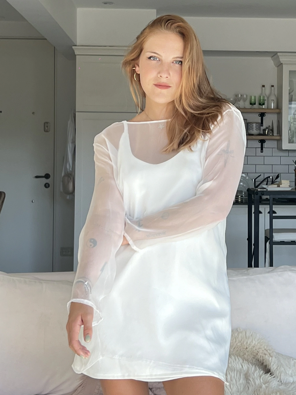 Vestido en gasa de seda natural con vestido en creppe elastizado (separado) como forro.