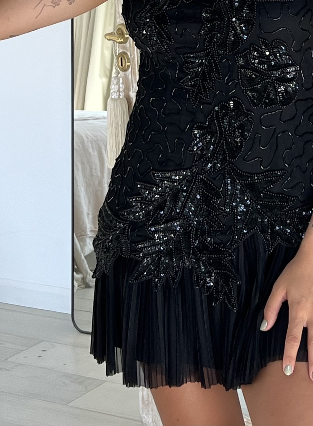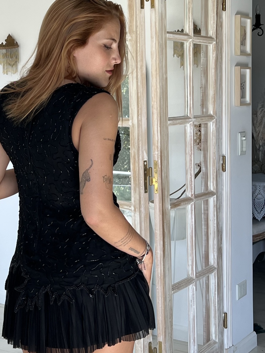 Vestido bordado con cierre en la espalda y plisado en el ruedo. Edición Limitada.